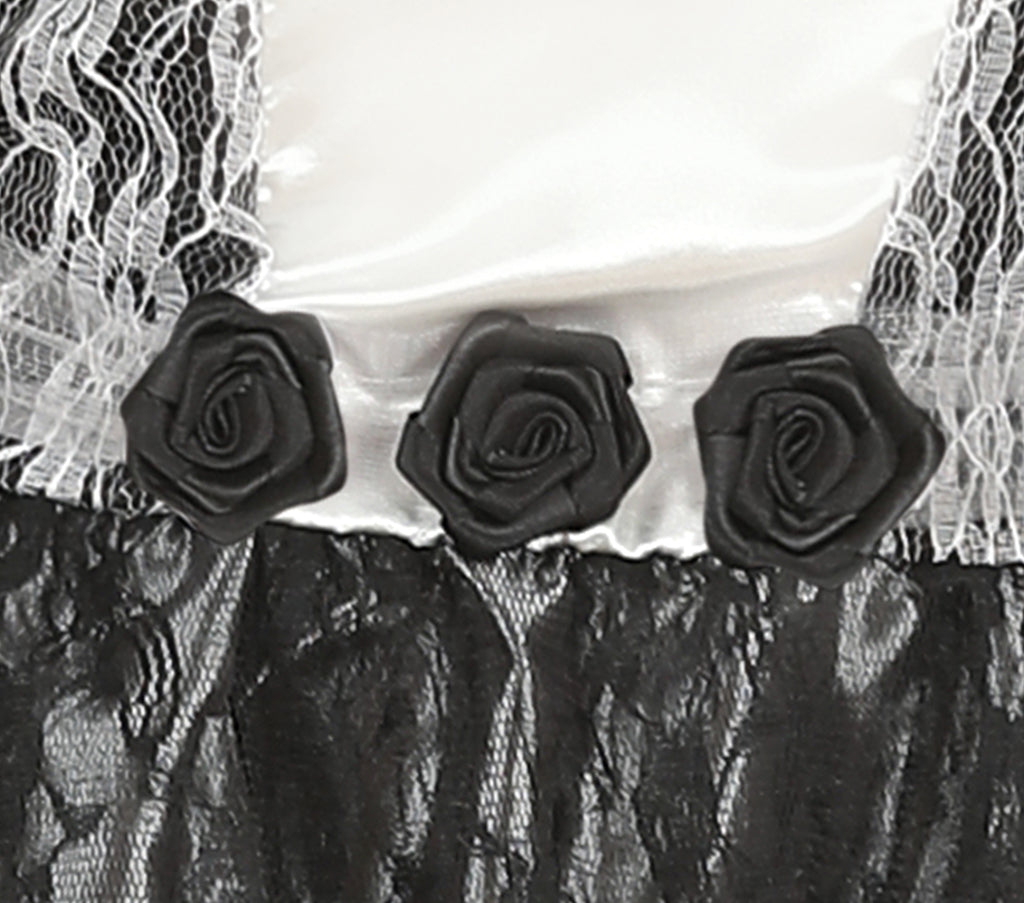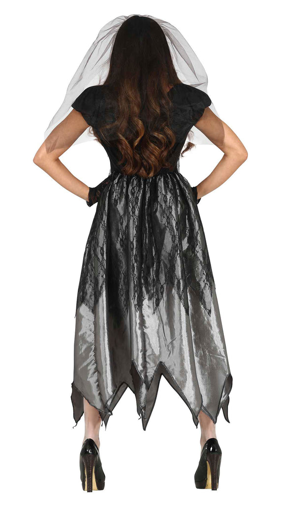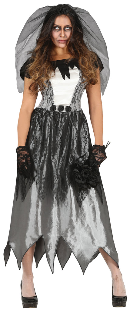 Tauche ein in die mystische Welt der Geister und Spukgeschichten mit diesem fesselnden Halloween Brautkleid. Der schwarze Schleier schwebt geheimnisvoll über den Schultern, während das Spitzenkleid mit asymmetrischen Details eine gespenstische Eleganz verleiht. Perfekt für eine düstere Ballnacht oder eine unvergessliche Party. Die Kombination aus dunklen Farben und den zarten Spitzen verleiht diesem Outfit einen unheimlichen Charme, ideal für die Geisterstunde.