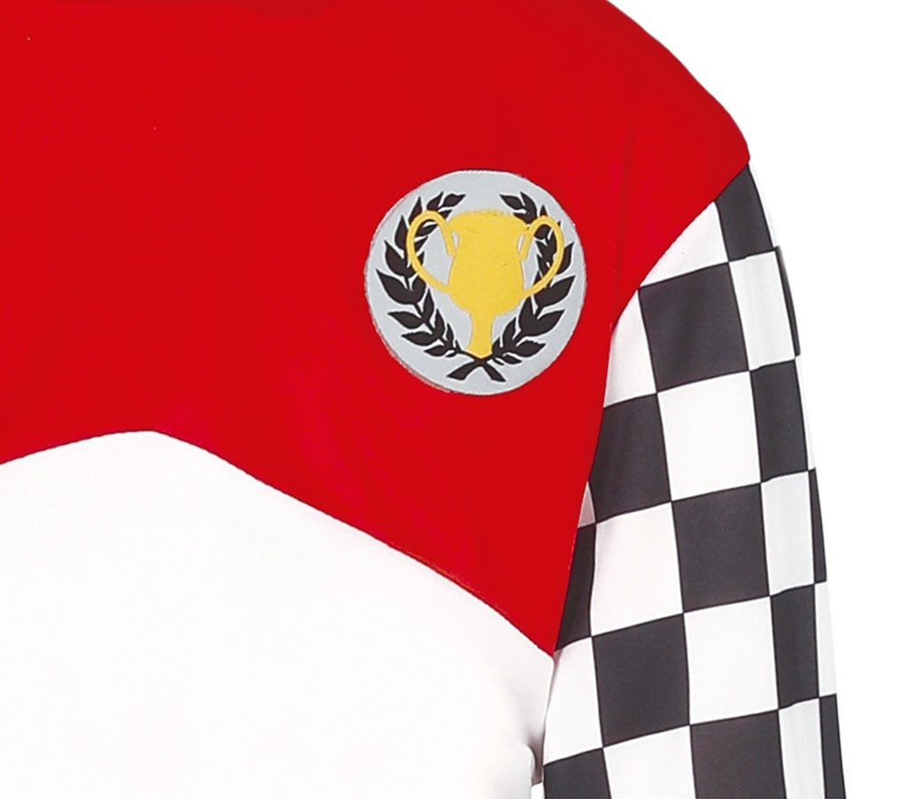 - Rot leuchtendes Rennoutfit mit schwarzem und weißem Karomuster auf Ärmeln und Seitenteilen für authentischen Motorsportuniformcharme