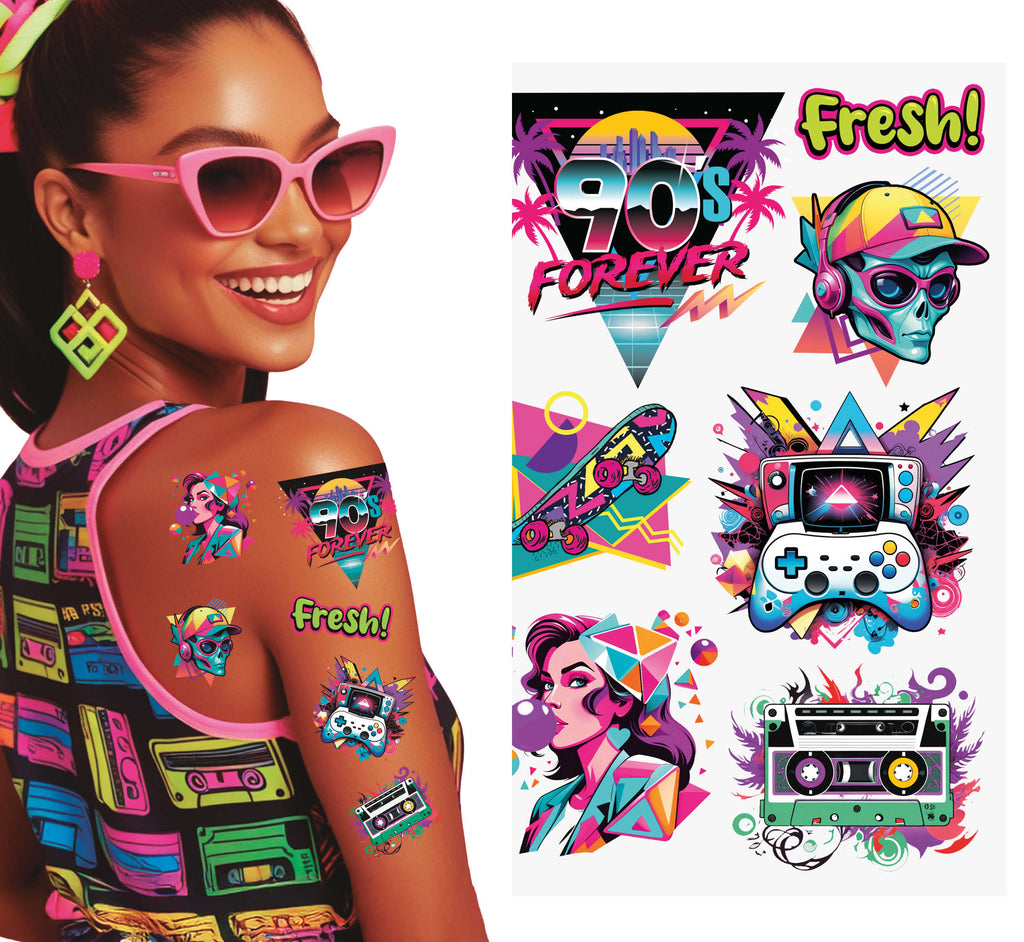 Tauche ein in die bunte Welt der 90er Jahre und bringe die ikonische Ästhetik mit temporären Hautmotiven auf deine Haut. Diese Motive erzählen von einer Ära gefüllt mit leuchtenden Farben und digitalen Designs, die sofort an den Charme alter Videospiele und Kassetten erinnern. Perfekt für den Karneval, gestaltest du mit auffälligen Grafiken wie Acid-Wash-Jeans und Neonfarben eine visuelle Zeitreise. Sie vereinen den Geist der damaligen Popkultur und schillernden Partyatmosphäre, während sie deine Individualität und Nostalgie zur Schau stellen und sowohl bei Aktivitäten im Tageslicht als auch auf abendlichen Festen wirken.