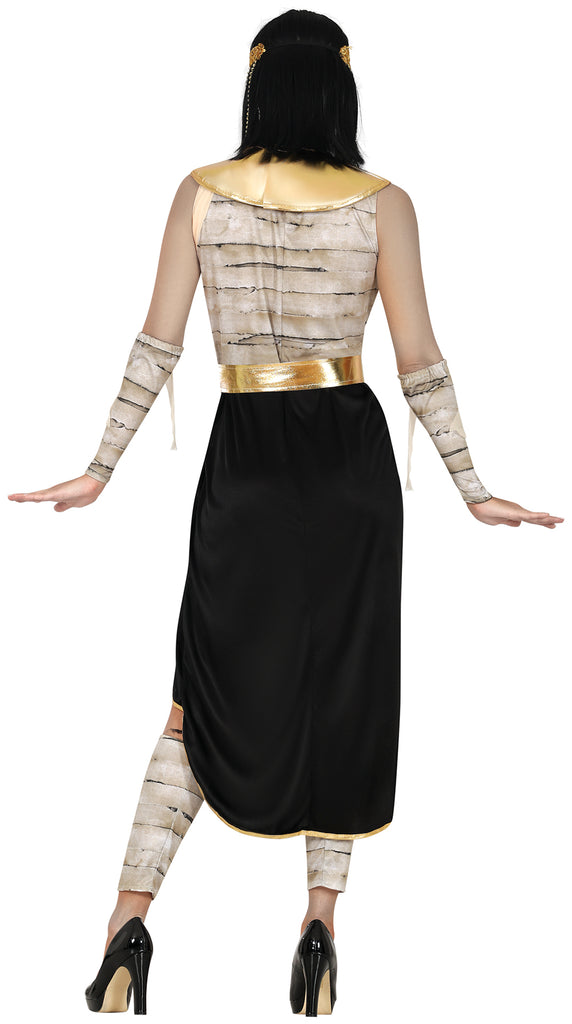 Die kunstvollen Muster auf der schwarzen Robe und die goldenen Akzente bringen ein Hauch von Mysterium und königlicher Pracht. Ergänzt wird das Ensemble durch einen zauberhaften Mumienschleier, der das ägyptische Flair betont. Ein perfekter Auftritt für jede Halloween-Feier oder antike Themenparty.