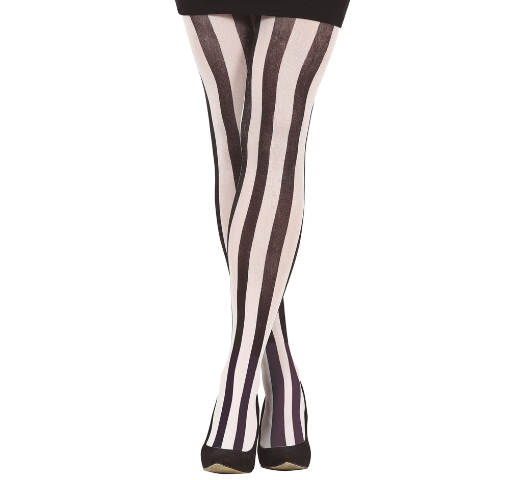 In edlem Schwarz und Weiß, diese gestreifte Strumpfhose verleiht jedem Kostüm den Hauch von verspielter Eleganz. Perfekt für die Bühne des Halloween-Abenteuerns, wo geheimnisvolle Clowns und elegante Figuren die Szene erobern. Diese Strumpfhose fügt sich nahtlos in die Palette von Schauer und Charme ein. Das monochrome Muster erinnert an die klassische Zirkus-Ästhetik, ideal für jene, die auffallen wollen. Ob als raffinierte Ergänzung zu einem Clown-Kostüm oder als auffälliger Akzent in der Alltagsgarderobe, diese Strumpfhose inspiriert zu stilvollen Auftritten und kreativen Kombinationen. Fühlen Sie die Magie von zeitloser Mode bei jedem Schritt auf der Party oder im Alltag.