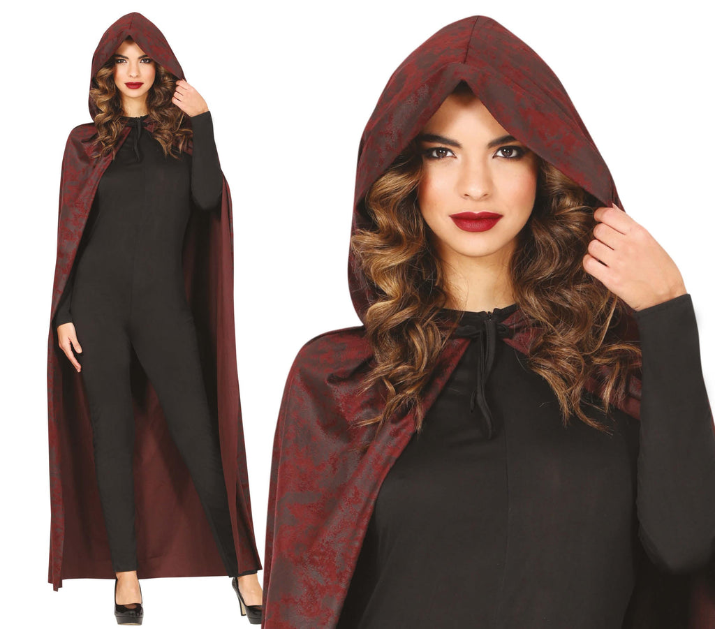 • Eleganter Umhang in Rot und Schwarz mit geheimnisvoller Kapuze