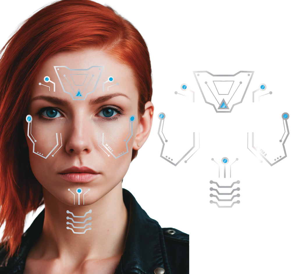 Erleben Sie ein Hauch von Zukunft mit diesem faszinierenden Gesichtstattoo. Perfekt für die Karnevalszeit, verleiht es Ihrem Look eine mystische Cyborg-Ästhetik mit glänzenden Akzenten in Blau und Silber. Lassen Sie sich von der technologischen Eleganz und den filigranen Linien inspirieren, die jeden Karneval zum futuristischen Erlebnis machen. Ideal für kreative Schminke und Cosplay-Ideen, verwandeln diese temporären Designs jedes Gesicht in ein einzigartiges Kunstwerk. Erleben Sie die Symbiose von Mensch und Maschine auf Ihrer Haut und tauchen Sie ein in eine Welt voller Fantasie und technischer Magie.