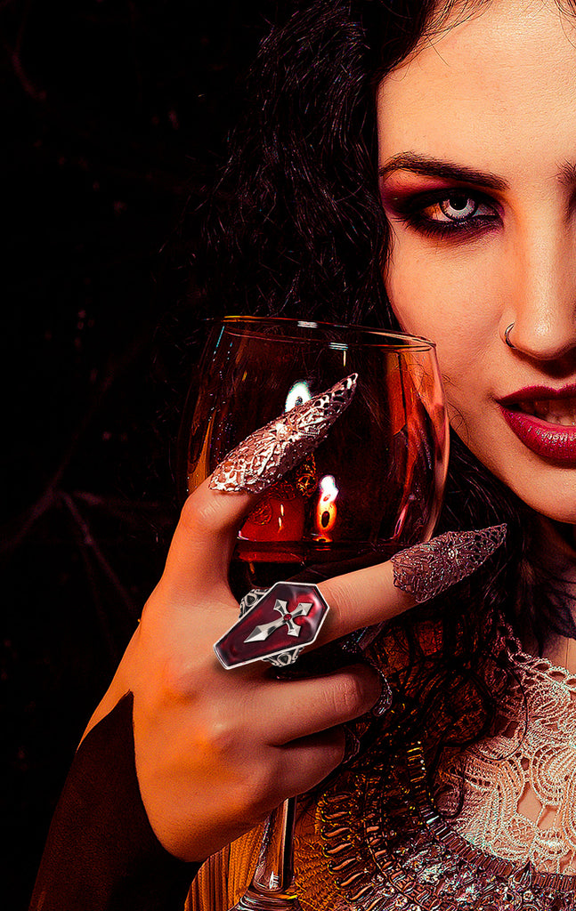 Betreten Sie die mystische Welt der Dunkelheit mit diesem eindrucksvollen Halloween-Ring. Das Design erinnert an ein gotisches Kreuz auf einem geheimnisvollen Sarg, umhüllt von tiefem Rot und geheimnisvollem Schwarz. Perfekt für jene, die das Unbekannte und Unheimliche lieben. Tragen Sie diesen Ring als Statement für Ihre düstere Seite und lassen Sie sich von der Aura des Geheimnisvollen umhüllen. Ein ideales Accessoire für jede Halloween- oder Gothic-Veranstaltung, das für Aufsehen sorgt. Entdecken Sie die Kraft und Eleganz dieses einzigartigen Schmuckstücks.