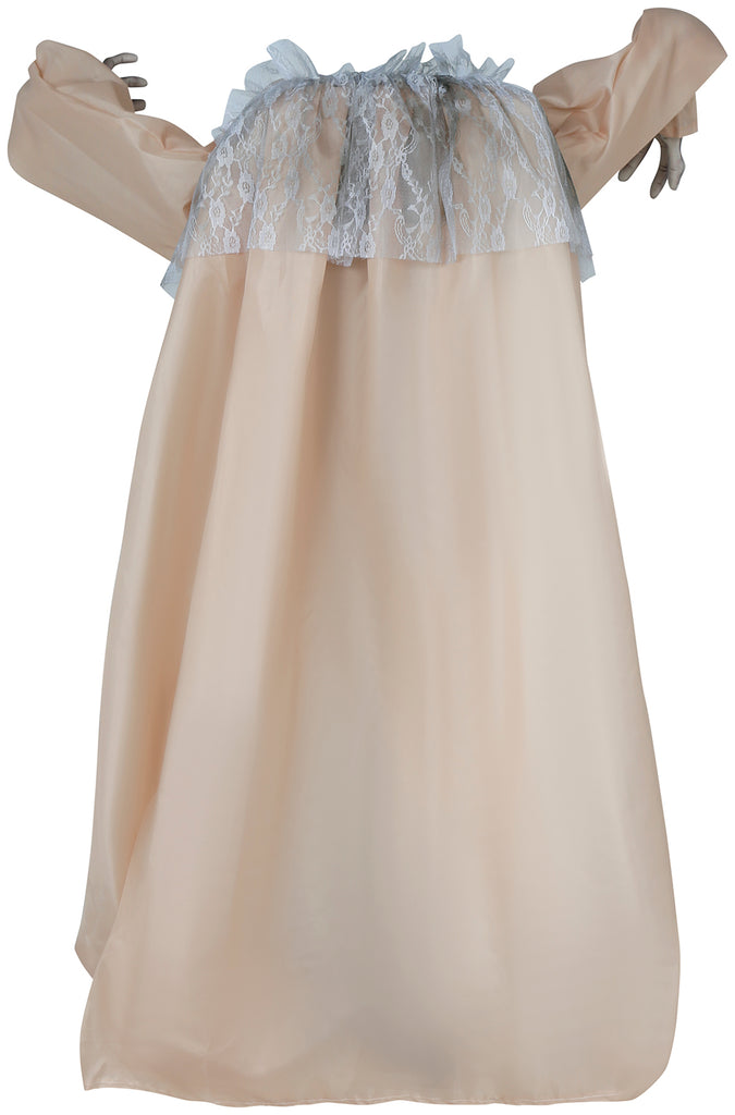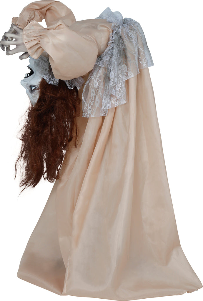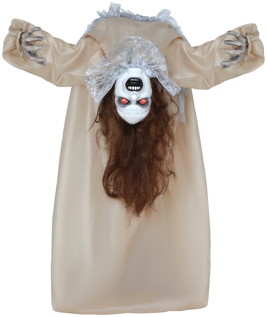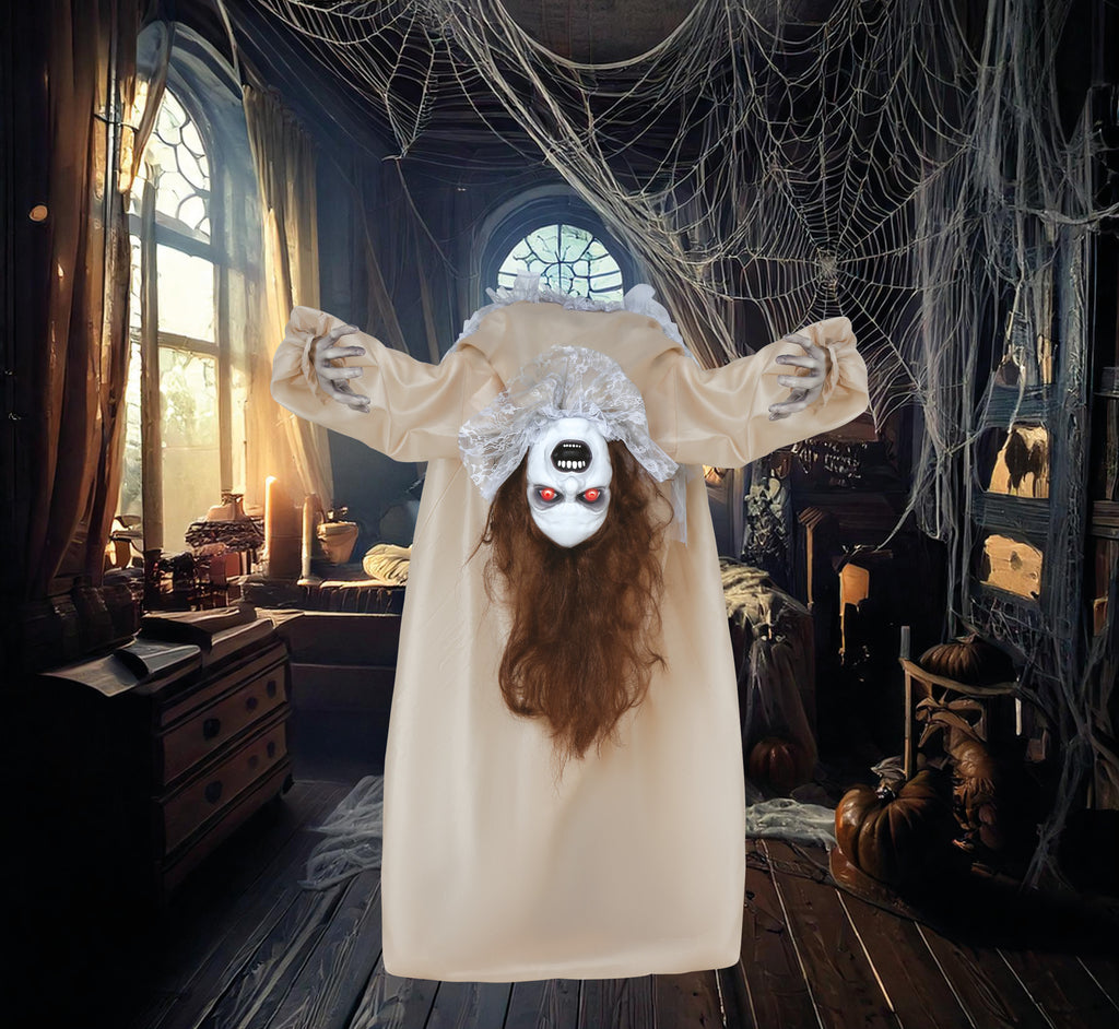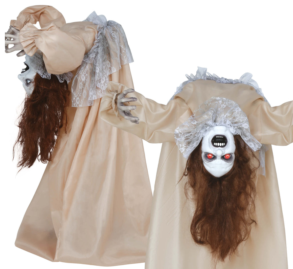 Diese unheimliche Halloween-Figur steht Kopf und zieht mit ihrem furchterregenden Ausdruck alle Blicke auf sich. Ihre rot leuchtenden Augen und ihr angsteinflößendes Lächeln machen sie zur perfekten Ergänzung für jede gruselige Dekoration. Die langen, dunklen Haare und ihr altertümliches Kleid sorgen für eine gespenstische Atmosphäre. Ideal für Halloween-Partys und als schockierende Überraschung in dunklen Ecken, diese Figur verkörpert den Geist der Geistersaison mit schauriger Eleganz.