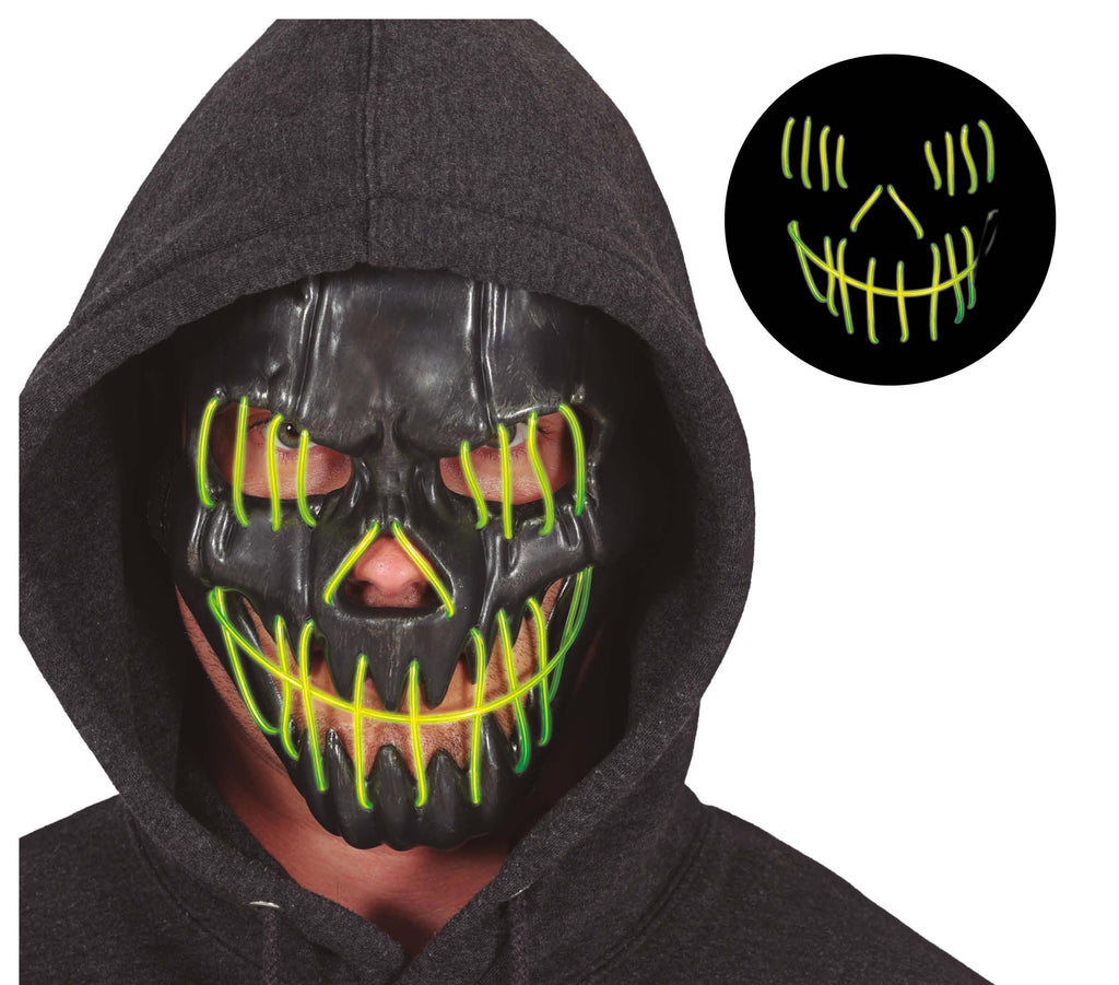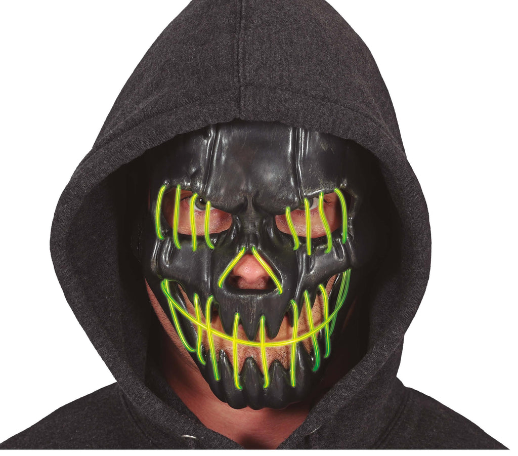 • Schrecklich grinsende Maske in Schwarz mit leuchtenden Neongelben Akzenten für ein auffälliges Erscheinungsbild