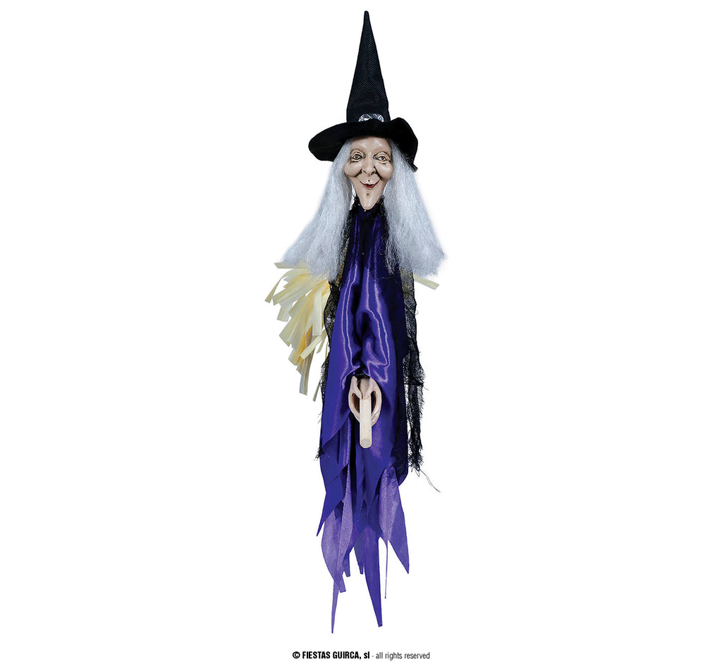 Diese Hexenfigur verzaubert jeden Raum mit ihrem geheimnisvollen Charme. Ihr lila Kostüm leuchtet in magischem Schein und die detailreiche Gestaltung entführt in die Welt der Märchen und Legenden. Auf einem Besen reitend, scheint sie bereit, in die Nacht zu fliegen, begleitet von einem Hauch uralter Zauberei. Ihr spitzer Hut und die langen, silberweißen Haare verleihen ihr ein authentisches Aussehen, das perfekt zur gruseligen Atmosphäre von Halloween passt. Diese dekorative Figur schafft eine einzigartige, mystische Stimmung und ist ein echter Hingucker für jede Halloween-Dekoration.