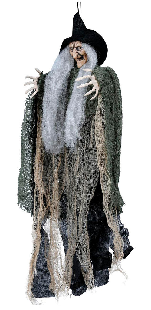 Diese beeindruckende Hexenfigur schwebt geheimnisvoll und bringt den Zauber von Halloween in jeden Raum. Der ausdrucksstarke, gruselige Gesichtsausdruck und das lange, graue Haar verleihen dieser Figur eine mystische Ausstrahlung. Der schwarze Hexenhut und die düstere Kleidung erinnern an die Hexen der alten Sagen und Mythen. Ideal für eine gruselige Halloween-Kulisse oder als Blickfang bei Horror-Mottopartys. Erleben Sie, wie diese Figur im schummrigen Licht für zusätzlichen Schauer sorgt, während sie über den Köpfen der Gäste schwebt. Lassen Sie sich von der Präsenz dieser Hexe verzaubern und tauchen Sie ein in die faszinierende Welt der Magie und des Spuks.