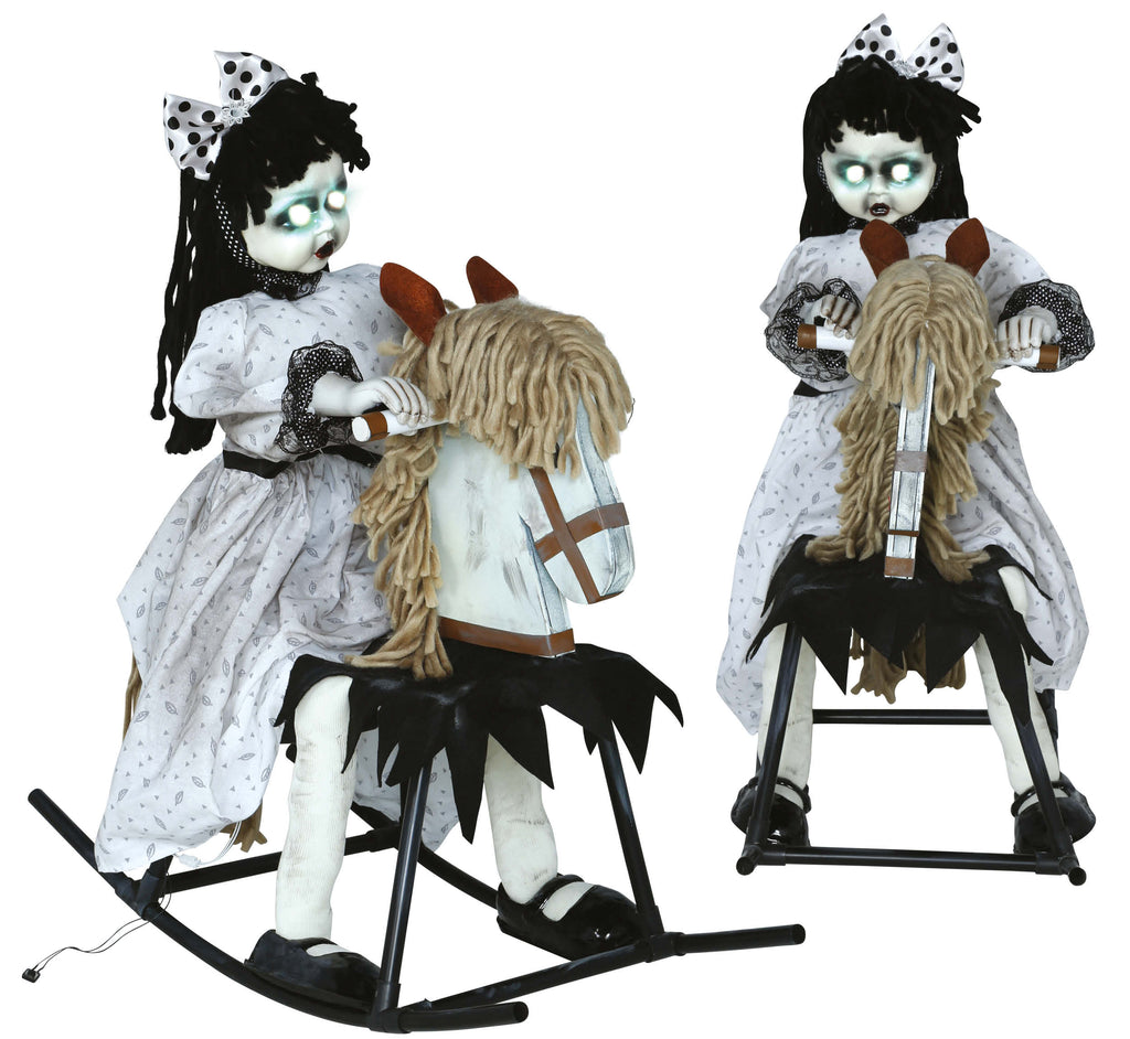 - Geisterhafte Hexenpuppe auf einem robusten Schaukelpferd