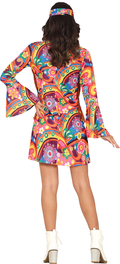 Erleben Sie das Gefühl einer unbeschwerten Festival-Zeit mit diesem bunten Hippie-Kostüm. Das Design ist inspiriert von der freigeistigen Ära der 60er und 70er Jahre, als Musik, Liebe und Freiheit die Luft erfüllten. Das Kleid mit lebendigem Blumenmuster und farbenfrohen Kreationen weckt Erinnerungen an Psychedelic-Partys und lässt die Herzen von Vintage-Liebhabern höher schlagen. Ein passendes Stirnband gibt dem Outfit den letzten Schliff und sorgt für den authentischen Retro-Look. Tanzen Sie in den Tag mit einem Hauch von Nostalgie und dem Gefühl unendlicher Möglichkeiten. Perfekt für den Karneval oder jede andere Gelegenheit, bei der Sie in eine kreativ-abenteuerliche Rolle schlüpfen möchten. Tauchen Sie ein in eine farbenfrohe Welt der Friedenstauben und des guten Vibes.
