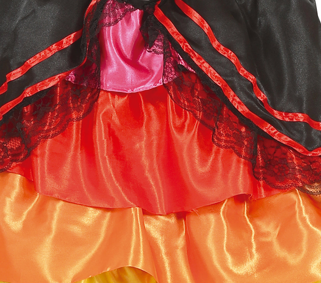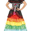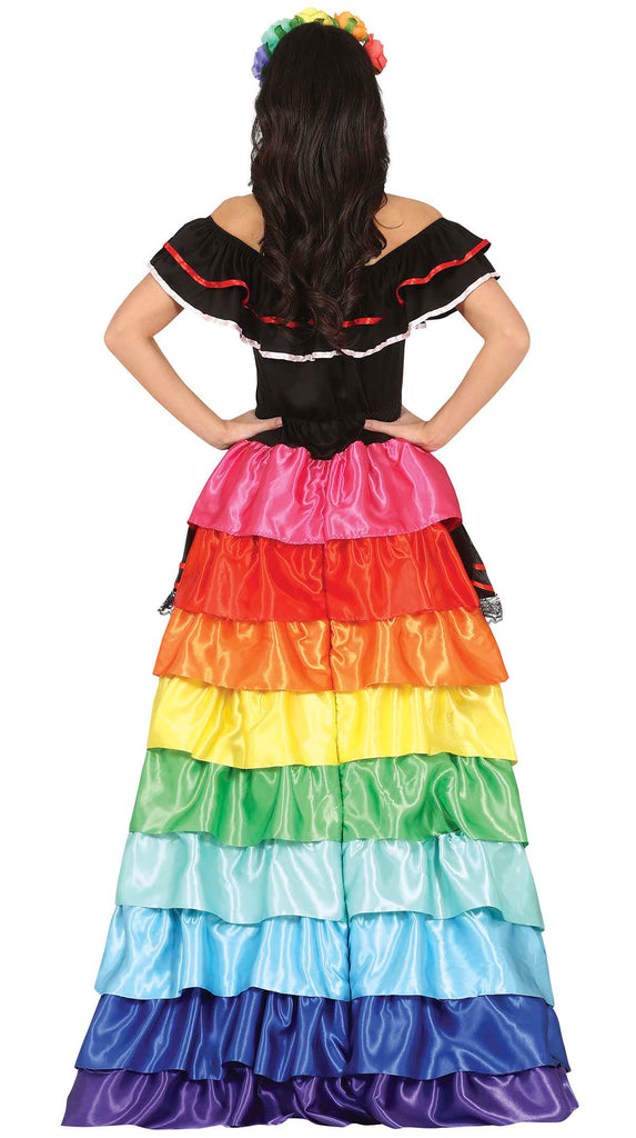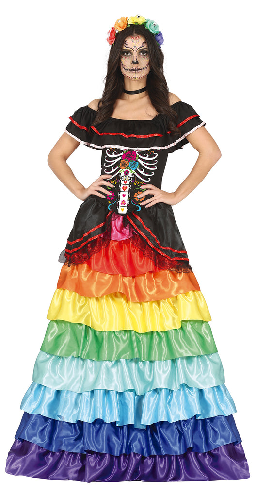 Dieses spektakuläre Knochentänzer-Kostüm entführt Sie in eine Welt voller lebendiger Farben und mysteriöser Eleganz. Das Outfit beeindruckt mit einem mehrschichtigen Rock in strahlenden Regenbogenfarben, der bei jeder Bewegung die Blicke auf sich zieht. Der auffällige Blumenkranz auf dem Kopf verleiht Ihnen eine festliche Aura, während das kunstvolle Skelettmuster eine geheimnisvolle Note hinzufügt. Lassen Sie sich von der Magie und dem Glamour dieses Festivalkleides inspirieren und werden Sie zum Mittelpunkt jeder Feier. Perfekt für besondere Anlässe, bei denen außergewöhnliche Outfits gefragt sind.