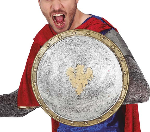 Erleben Sie die Magie vergangener Zeiten mit diesem prächtigen Schild, das den Glanz mittelalterlicher Geschichten in Ihre Hände legt. Die kunstvolle Verzierung in Gold und Silber lässt die altehrwürdige Symbolik lebendig werden und erinnert an tapfere Ritter und mystische Abenteuer. Perfekt für den Karneval, verwandelt es jeden Träger in eine imposante Gestalt aus fernen Legenden, bereit, die Vorstellungskraft in neuem Glanz erstrahlen zu lassen. Der robuste Rand schafft eine markante Silhouette, die an die berühmten Helden aus Sagen und Märchen erinnert. Gleiten Sie in die Rolle eines edlen Ritters oder einer majestätischen Königin und lassen Sie den Zauber vergangener Jahrhunderte aufleben.