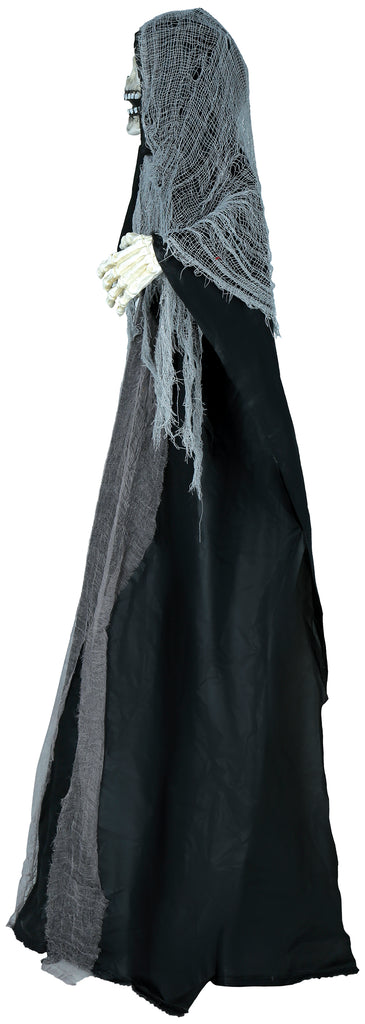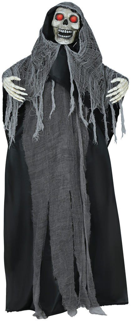 Tauchen Sie ein in die schaurige Welt des Unheimlichen mit dieser beeindruckenden Halloween-Dekofigur. Der Sensenmann mit gespenstischem Lächeln und finsteren roten Augen verbreitet eine Aura des Schreckens und der Mystik. Der schwarze Umhang, umrahmt von grauen Fetzen, lässt den Reaper lebendig erscheinen, als sei er direkt einem düsteren Märchen entsprungen. Ob als Dekoration für die Nacht des Grauens oder als Highlight jeder Gruselparty, dieses Skelett verleiht jedem Raum eine unvergessliche, schockierende Atmosphäre.