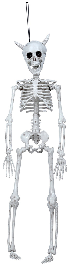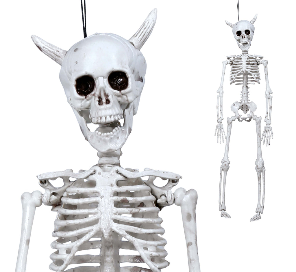 Diese unheimliche Hängefigur vereint das düstere Bild eines Skeletts mit einem dämonischen Charme. Die hervorstechenden Hörner und der markante Schädel machen diese Figur zu einem perfekten Mittelpunkt für jede Halloween-Dekoration. Sie zieht mit ihrem geheimnisvollen Look alle Blicke auf sich und sorgt für eine schaurige Atmosphäre, die Ihre Party oder Ihr Event unverwechselbar macht. Diese Figur erscheint wie ein aus einem Albtraum entstiegenes Wesen, bereit, in der Dunkelheit zu schweben und Furcht zu verbreiten.