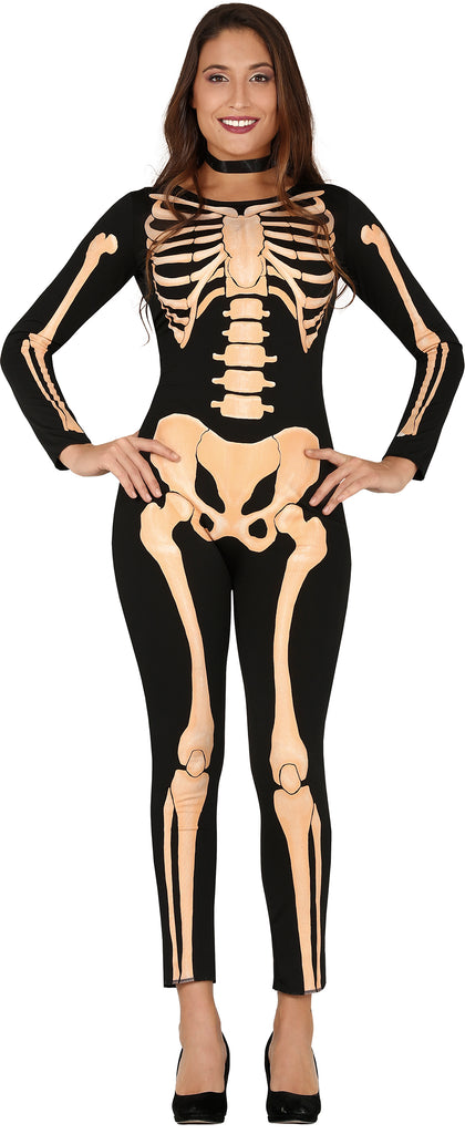 • Schwarzer Jumpsuit mit beigen Knochenmotiven für eine eindrucksvolle Gruseloptik