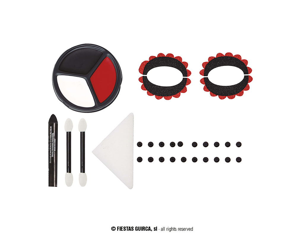 Malen Sie Ihr Gesicht in kräftigen Rot-, Schwarz- und Weißtönen und verzieren Sie es mit funkelnden Juwelen, die an die prachtvollen Altäre erinnern. Setzen Sie stilvolle Akzente mit den beiliegenden Augen-Konturen und tauchen Sie ein in eine Welt voller Mystik und Farbe.