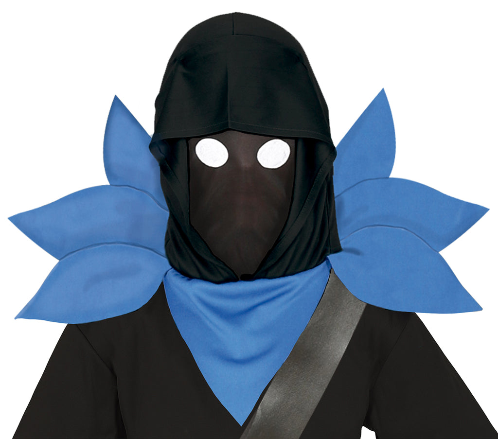 - Fantasievolles Kriegerkostüm aus der Welt der Videospiele mit schwarzer Kapuze und blauen Akzenten
